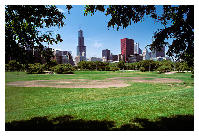 View of Michigan Avenue and Sears Tower from Grant Park on a quiet May afternoon.