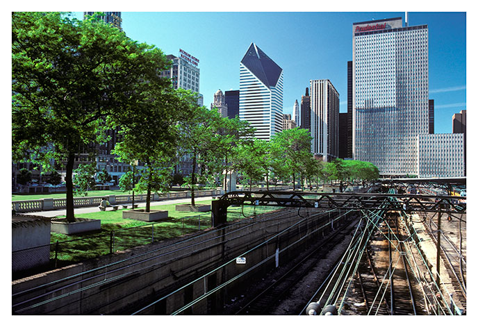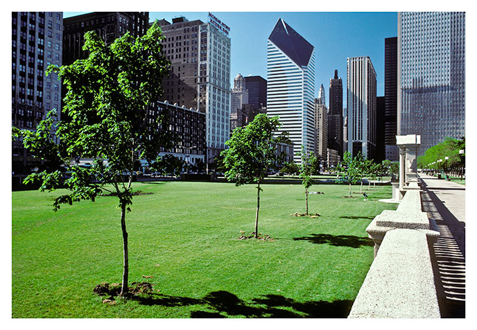 | Newly planted trees along Michigan Avenue, Millenium Park. View looking north with the Stone Building in the center distance. |