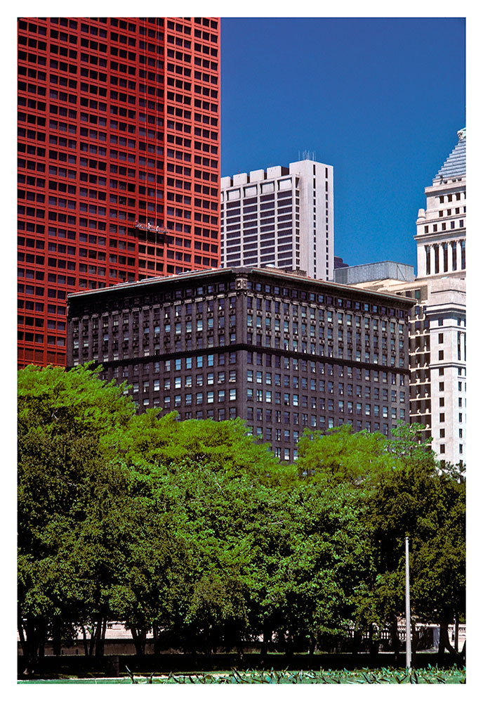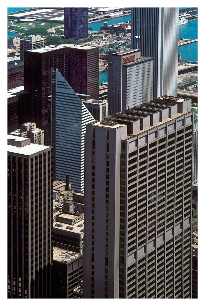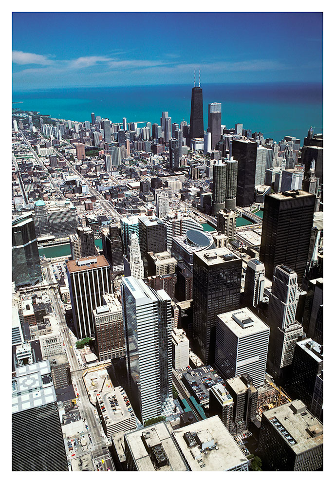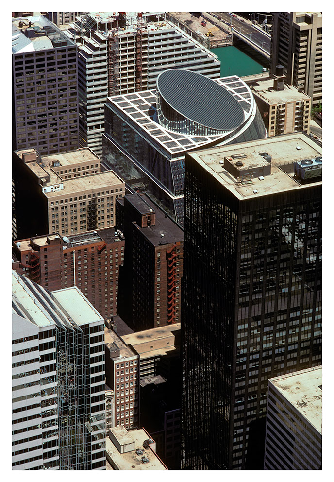 | View of Helmut Jahn's State of Illinois Center (James R. Thompspon center), from the top of Sears Tower, Chicago. |