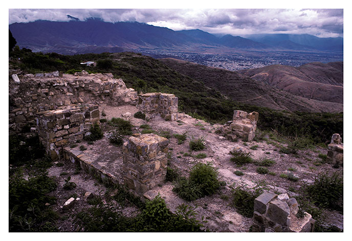 | Looking over the ruins of the Palace with the valley of Oaxaca far below to the left. View from the top of Building P. |
