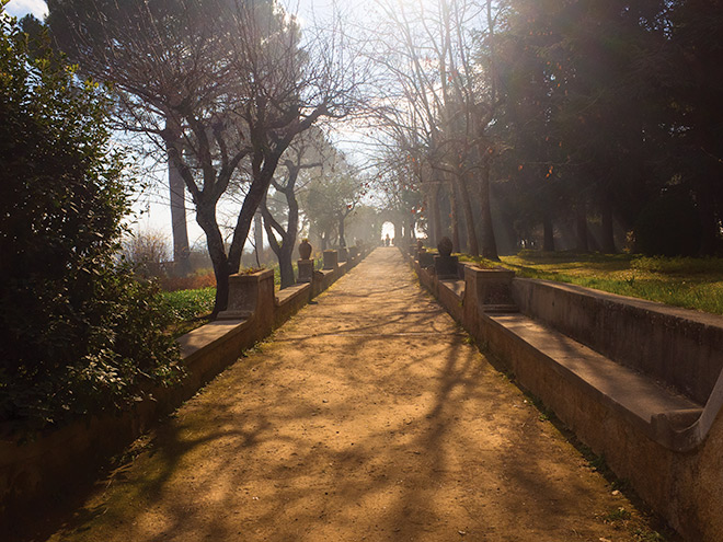 The Villa Cimbrone in one of the showplaces of Ravello, Italy, with extensive gardens and promonades, all perched on an eminence far above the town of Amalfi and the Amalfi coast. This view is of one of the many promenades in the gardens.