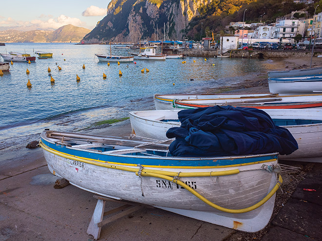Beached boats in the small boat harbor, Capri, next to the larger ferry terminal, looking east towards Sorrento.