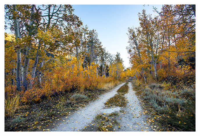 | Road along Rock Creek at dusk, with fall aspens. |