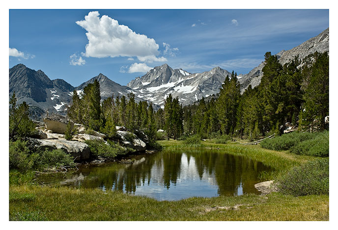 | This picturesque little tarn is along the trail to Mono Pass, a few hundered feet above Little Lakes Valley. Bear Creek Spire is here crowned with a banner cloud. |