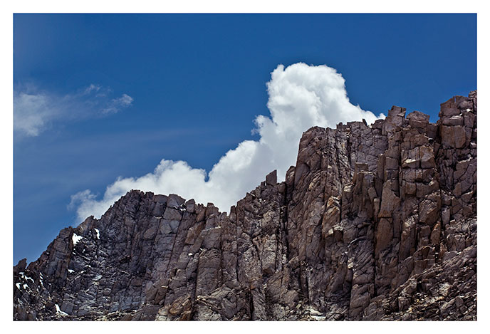 | One of the day's many thunderheads, this one seeming to slowly crawl over the clifftops above Little Lakes Valley near Mono Pass. |