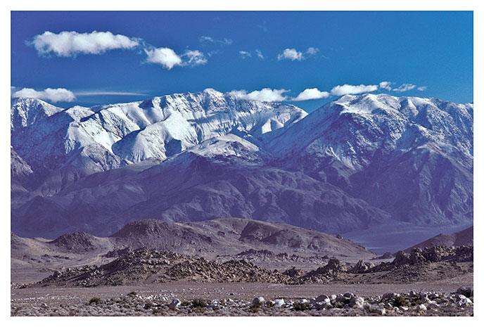 | Keynot peak (11,102 ft) is at the center of the picture. This view is from high on the road to Whitney Portal, outside of Lone Pine California, looking east. The piles of rubble in the foreground are the Alabama Hills. |