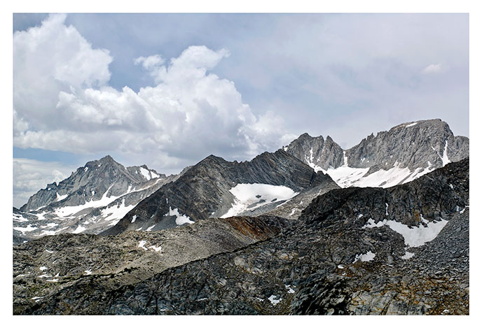 | In the center of the picture is Treasure peak. This view from Mono Pass, with rain clouds building by fits and starts overt the eastern slope of the Sierra. The occasional rain showers were very welcome this day, with temperatures over 70 degrees at 11,000 feet. |